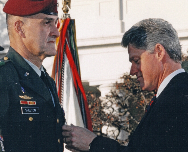 President Clinton presents General Shelton with medal, post Haiti operation - White House Rose Garden